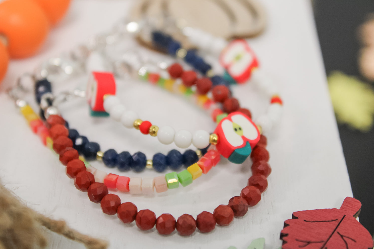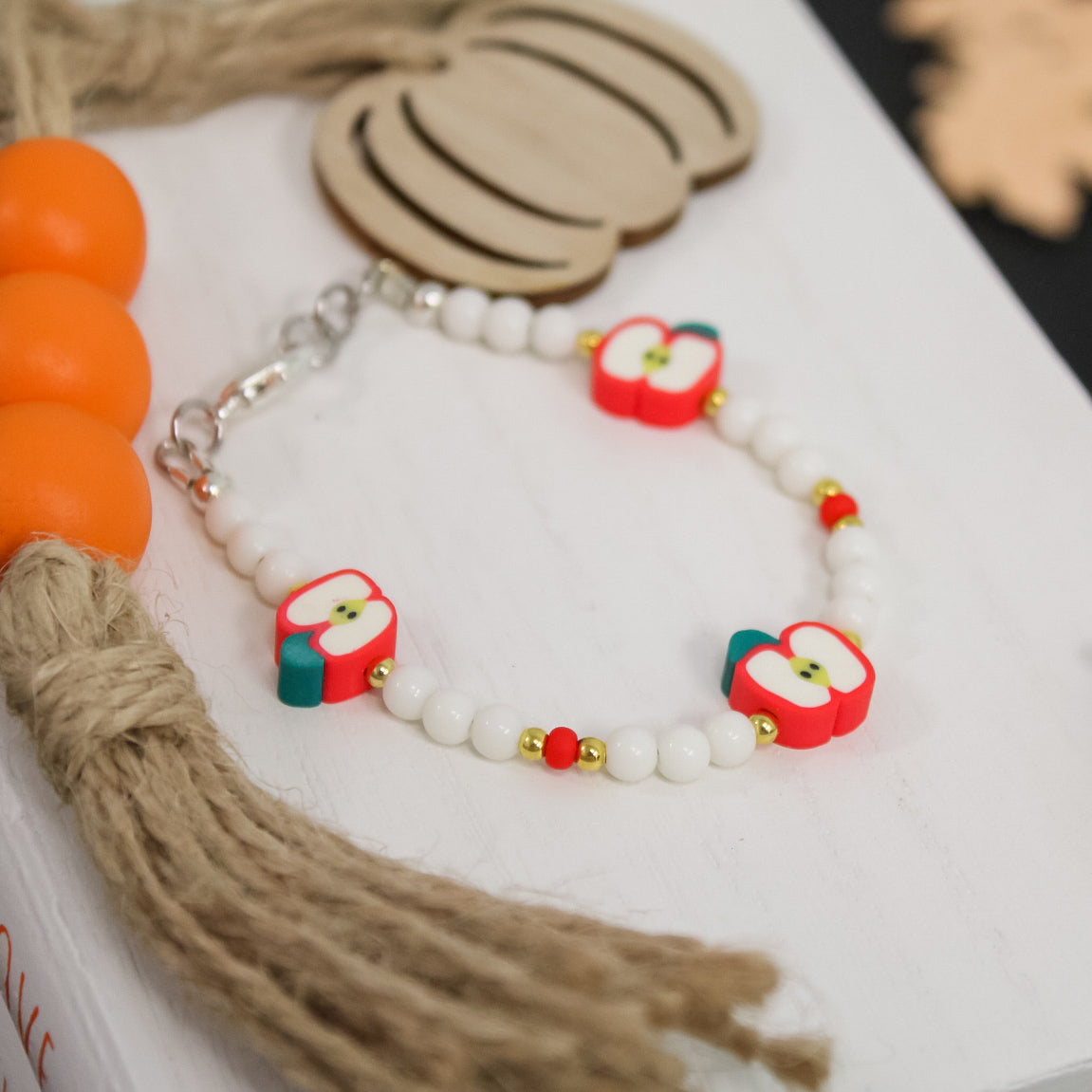 Sweet as cider and cozy as fall, the Apple Spice Bracelet is the perfect seasonal accessory! Featuring bright apple-shaped beads paired with crisp white and pops of red + gold(or silver), this bracelet feels like a trip to the orchard wrapped around your wrist.