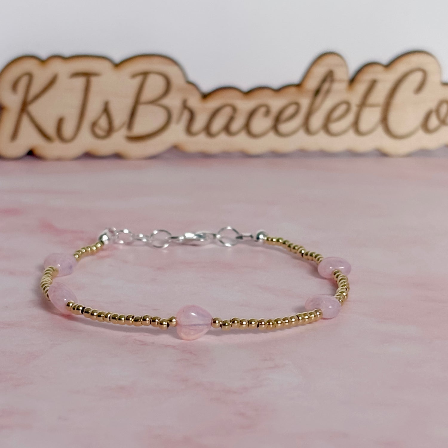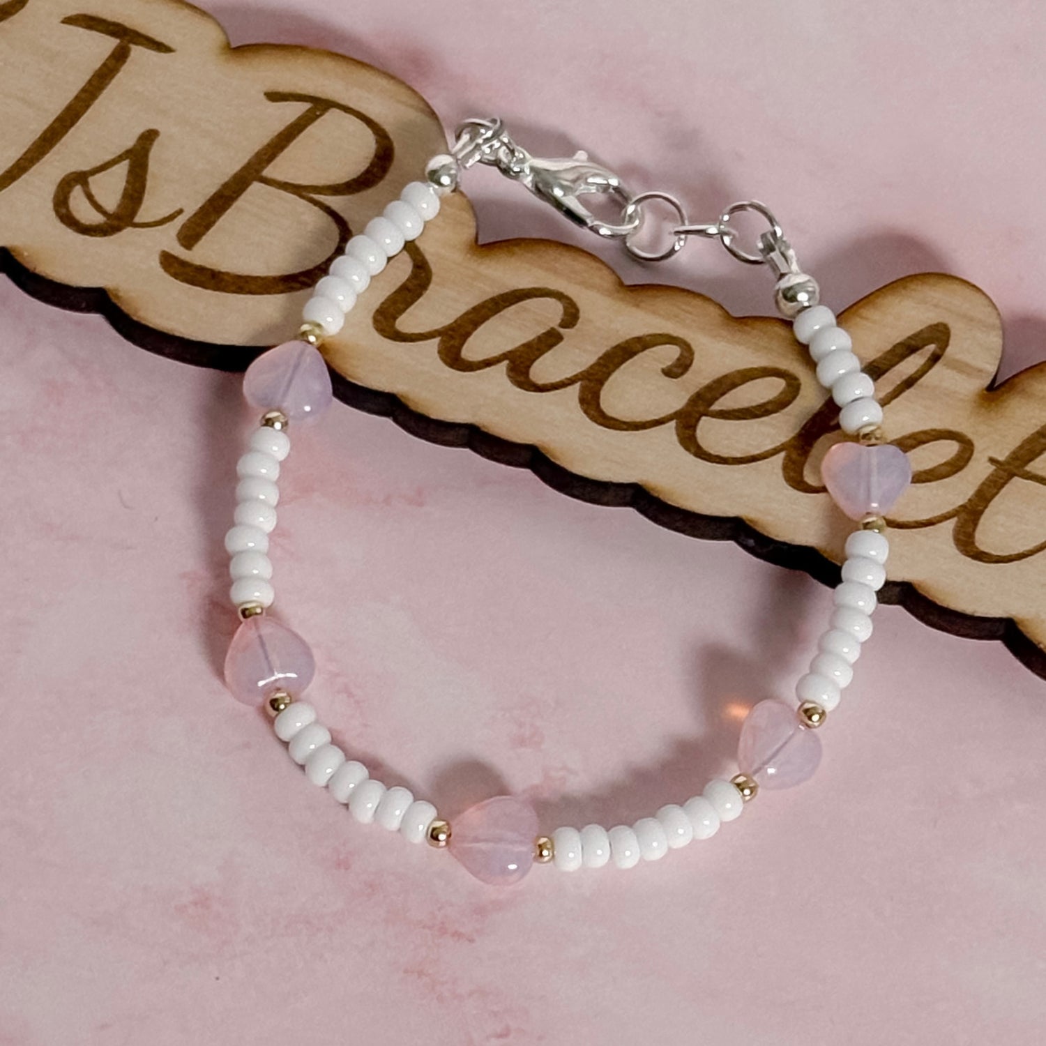 Soft, romantic, and effortlessly elegant. Blush & Grace features dreamy blush-pink heart beads paired with dainty spacer beads for the perfect Valentine touch. Feminine, minimal, and timeless, this bracelet is made to elevate any stack or shine beautifully on its own.