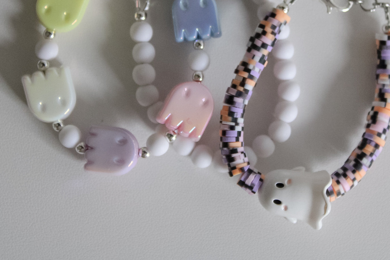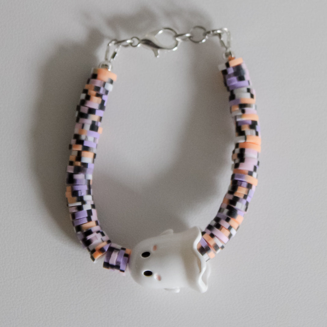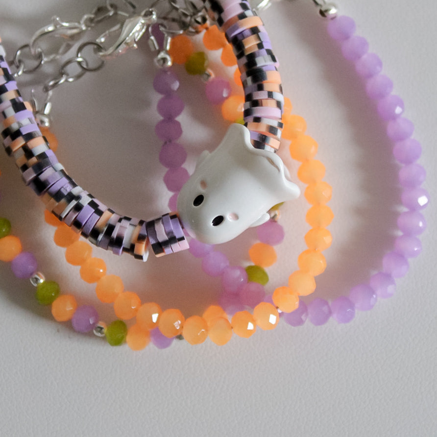 pastel mix of purple, peach, and black with the cutest little ghost charm, this piece is all about keeping Halloween sweet + chic. It’s playful, cozy, and perfect for stacking with your other fall faves or letting it steal the spotlight solo.