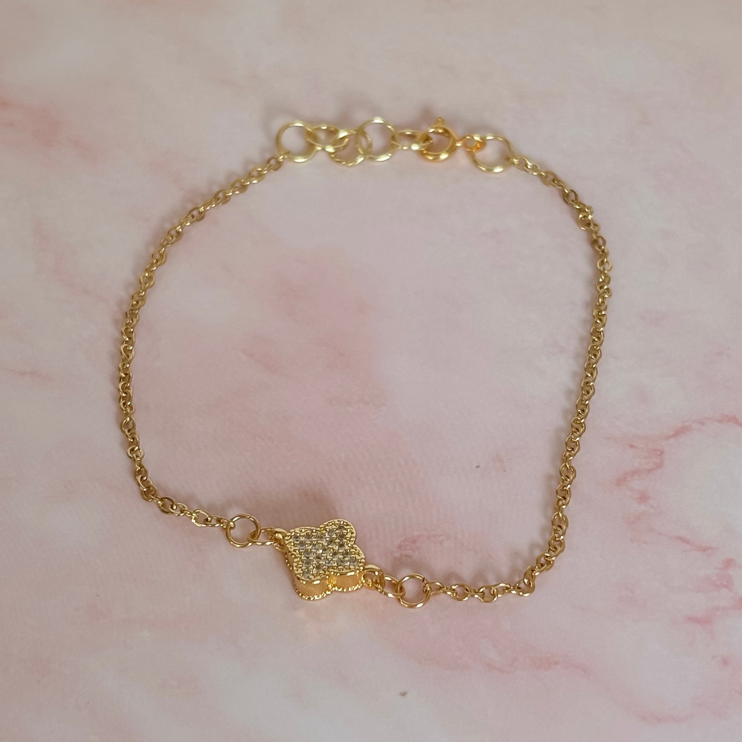 This dainty gold chain bracelet features a sparkling 18k gold filled CZ clover charm that adds the perfect touch of festive elegance to any St. Patrick’s Day look. Designed with a lightweight, minimalist style, it’s beautiful worn alone or layered with your favorite stacks.