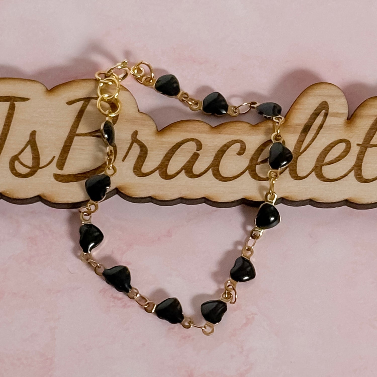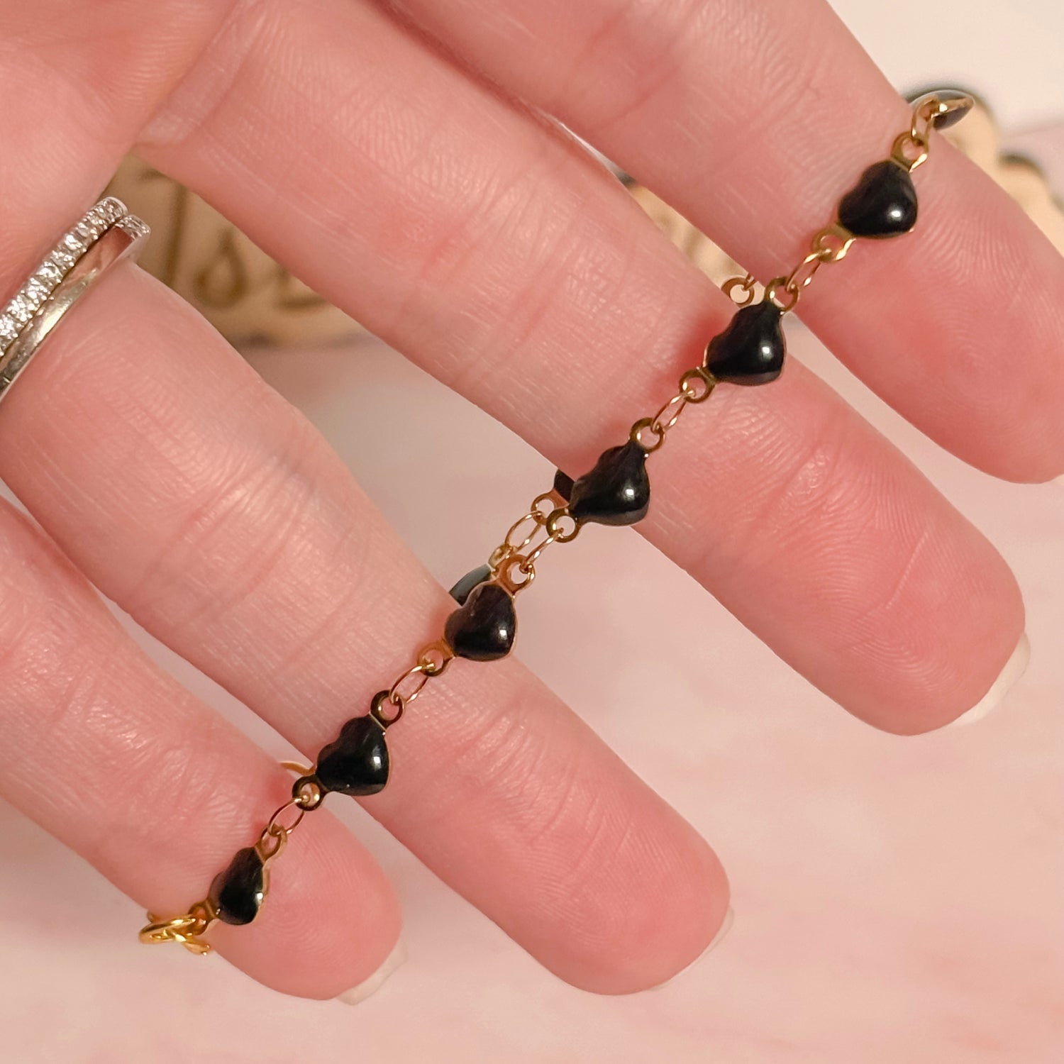 Moody, romantic, and irresistibly chic. Dark Romance features glossy black heart beads linked with warm gold chain accents for a bold yet feminine look. It’s the perfect mix of edgy and elegant, making it a standout piece in your Valentine collection.
