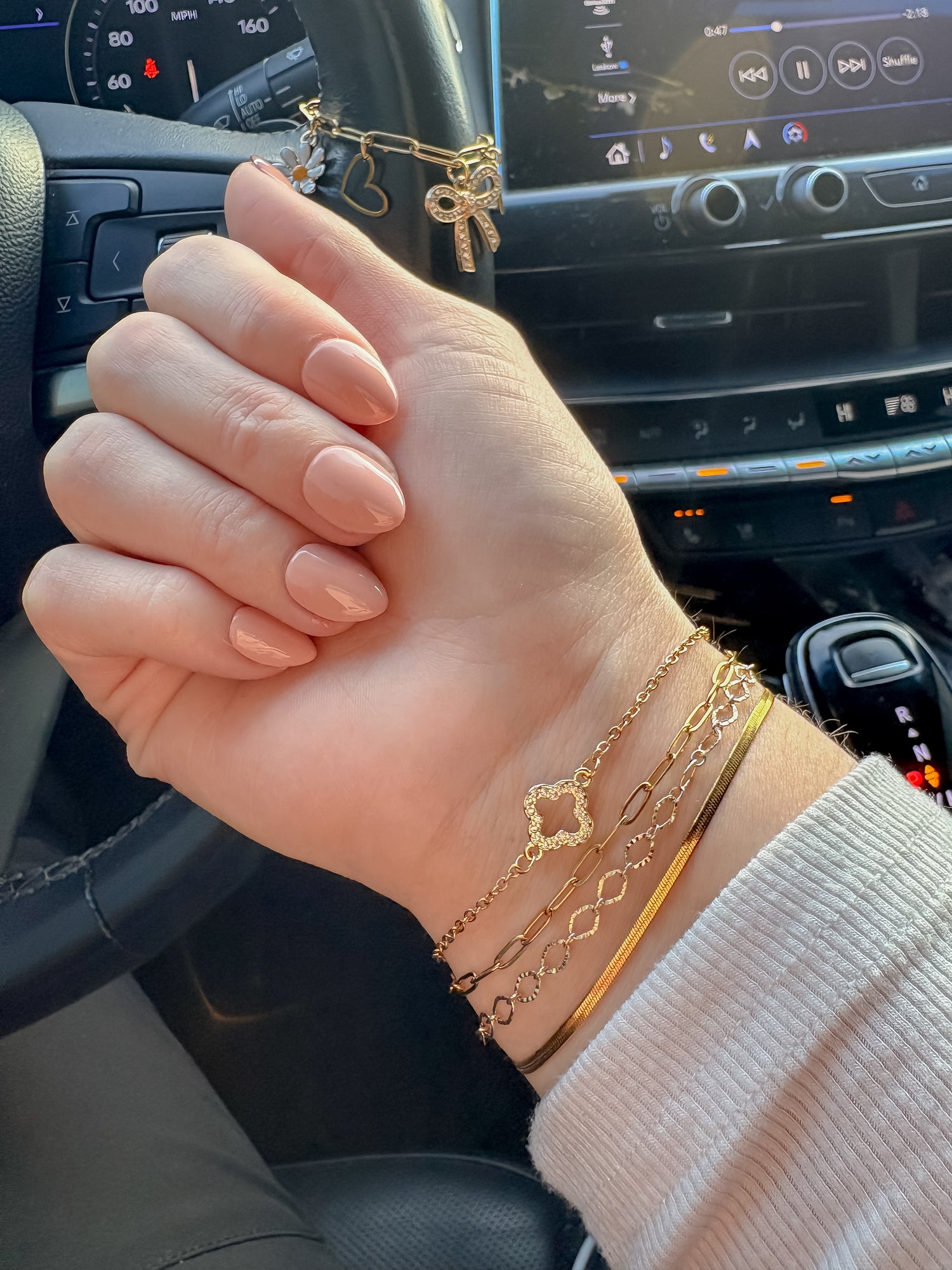 Available on a delicate chain as shown or as a sliding adjustable style that fits 5.0” up to 7.5”. This design does not have a stretchy option.