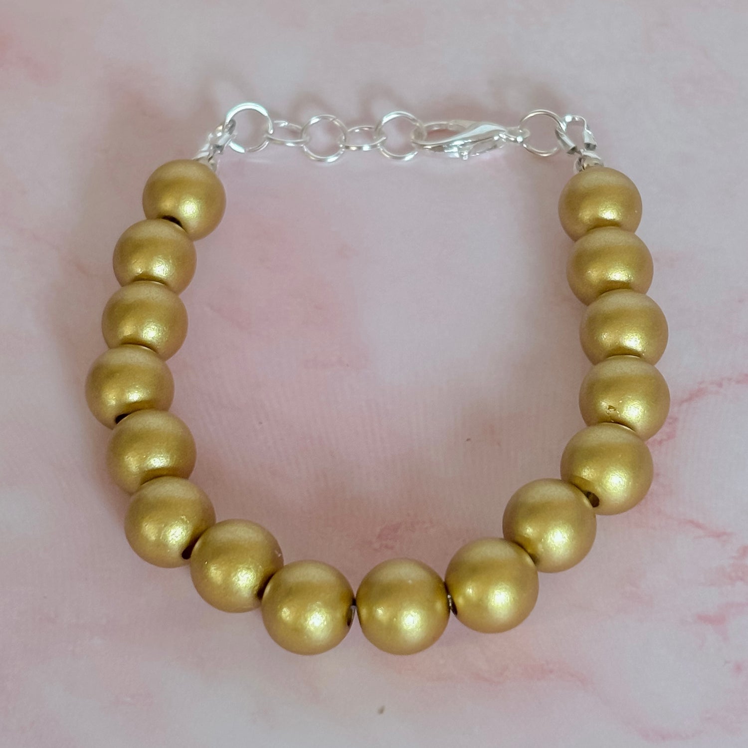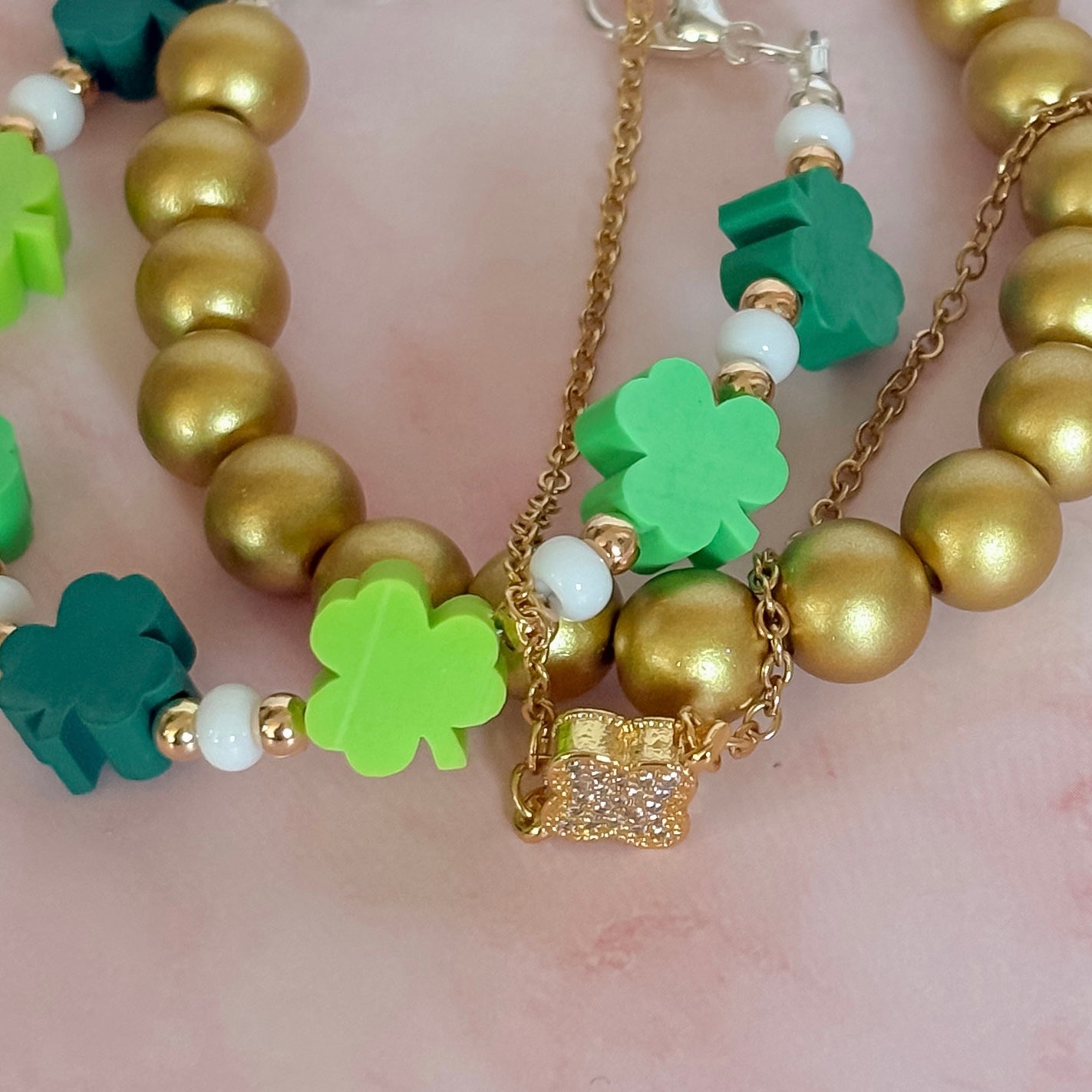 This bold beaded bracelet features rich metallic gold beads that bring the perfect touch of shine and luxury to any St. Patrick’s Day look. The warm golden tone makes it a statement piece on its own while still layering beautifully with your favorite stacks.