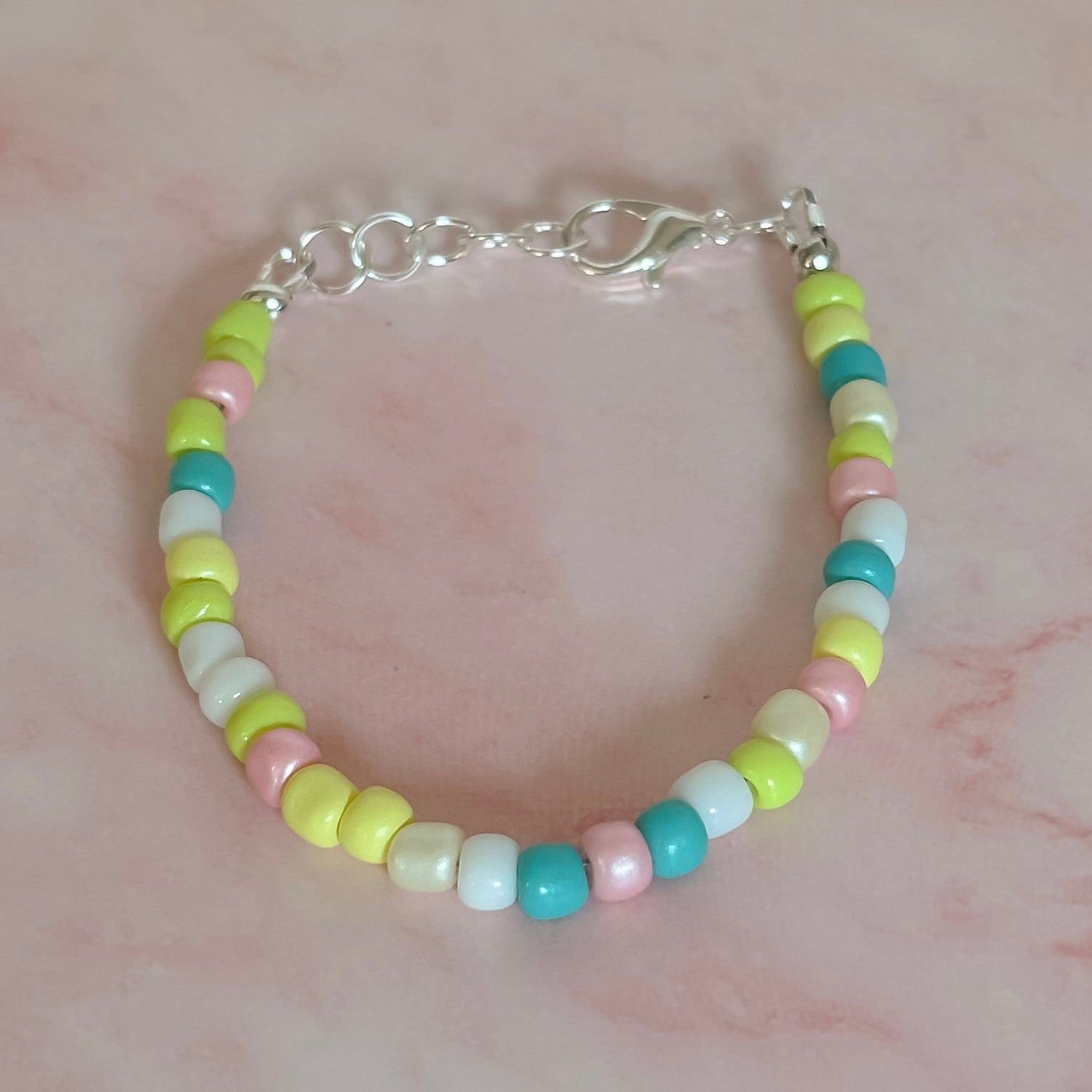 This cheerful beaded bracelet features a soft mix of pastel yellow, blush pink, aqua, and white beads for a playful and lighthearted St. Patrick’s Day look. The bright yet gentle color palette makes it fun for littles while still being cute enough for everyday wear.