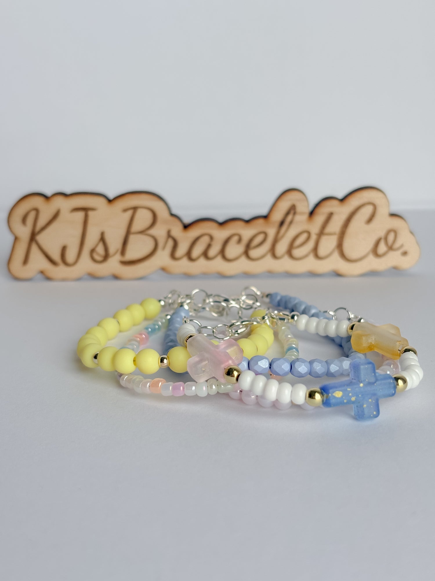 Blending baby blue, blush pink, soft peach, mint, lavender, and iridescent finishes, this bracelet adds subtle color and shine to any stack.
