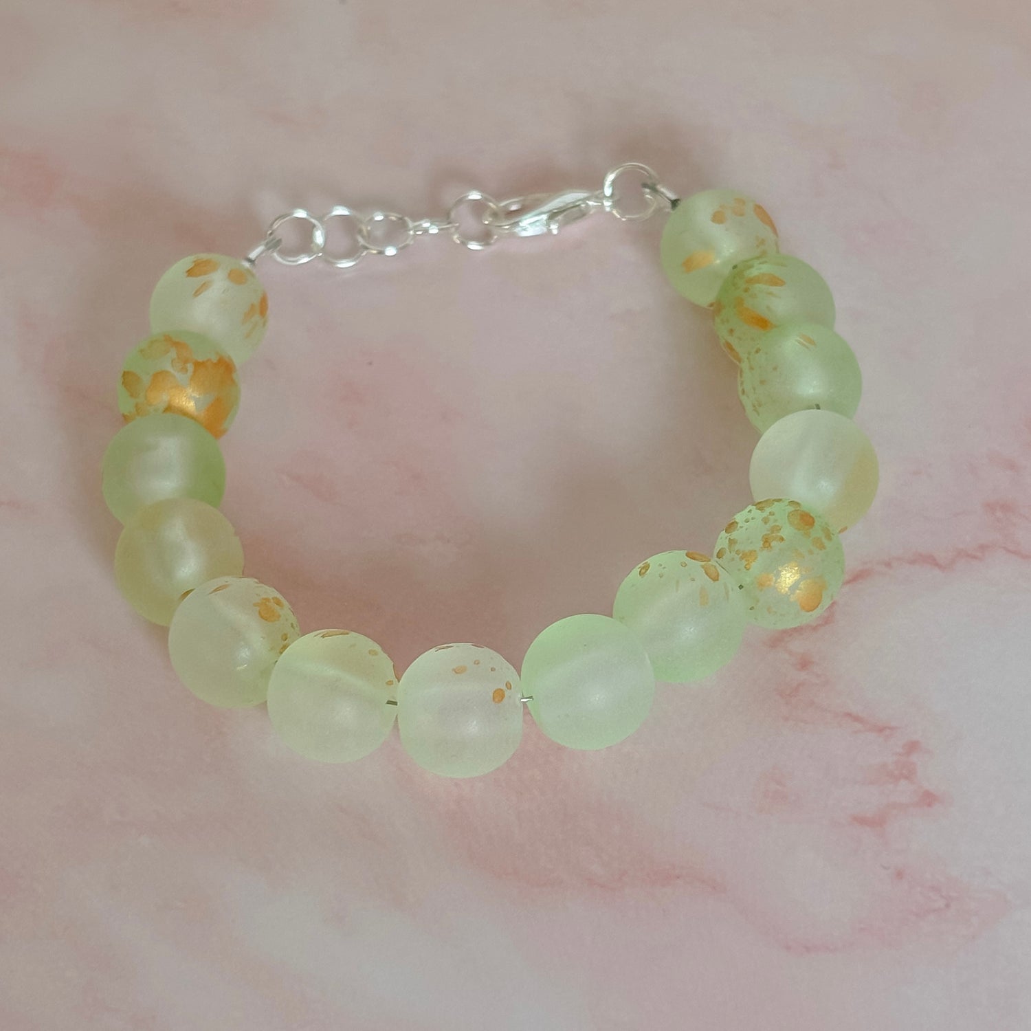 This beaded bracelet features soft mint green beads with subtle gold fleck detailing for a look that is light, fresh, and beautifully festive. The combination of pastel green and touches of gold gives it an elevated St. Patrick’s Day feel while still being neutral enough for everyday wear.